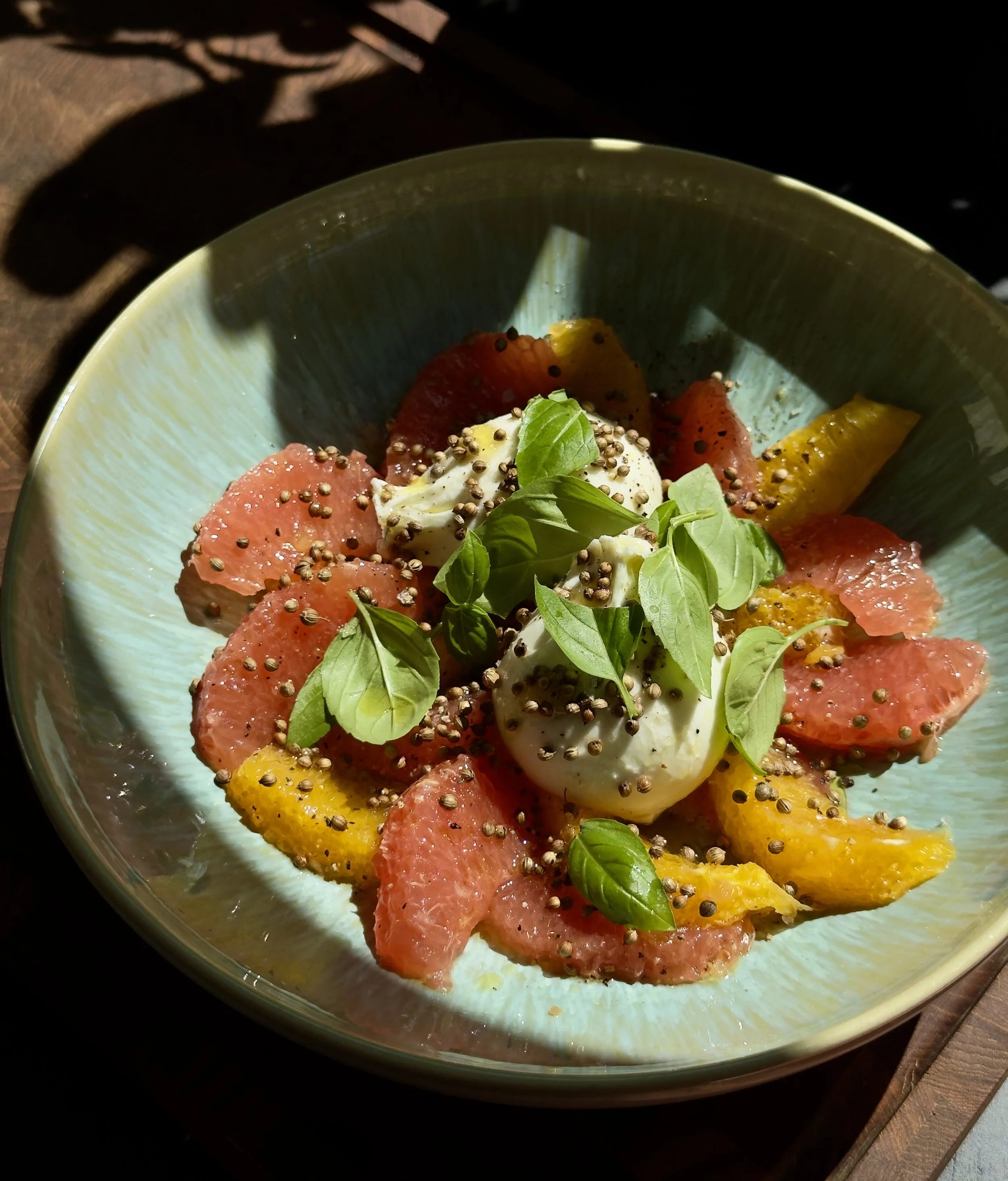 Cremet burrata, saftig grape og sød appelsin rammer hinanden i et perfekt citrus-crash. De ristede korianderfrø giver varme og dybde, dressingen samler trådene, og basilikum runder det hele af. Friskt, cremet, sprødt - og ren umami i hver eneste bid. En scoreret, der smager langt mere avanceret, end den er.