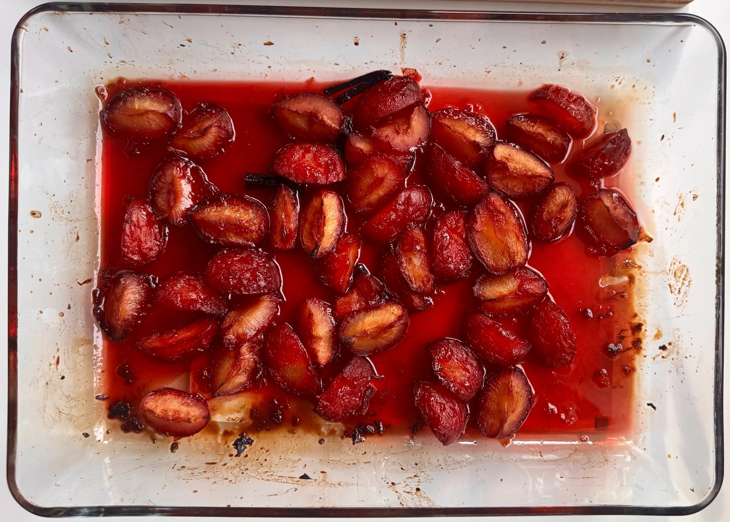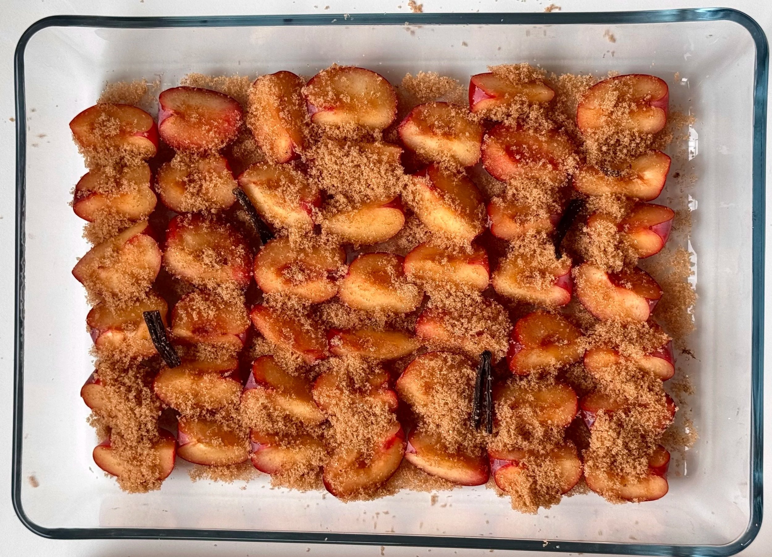 2) Fordel citronsaft, vanilje, vand og sukker jævnt over blommerne. Dæk fadet med folie.