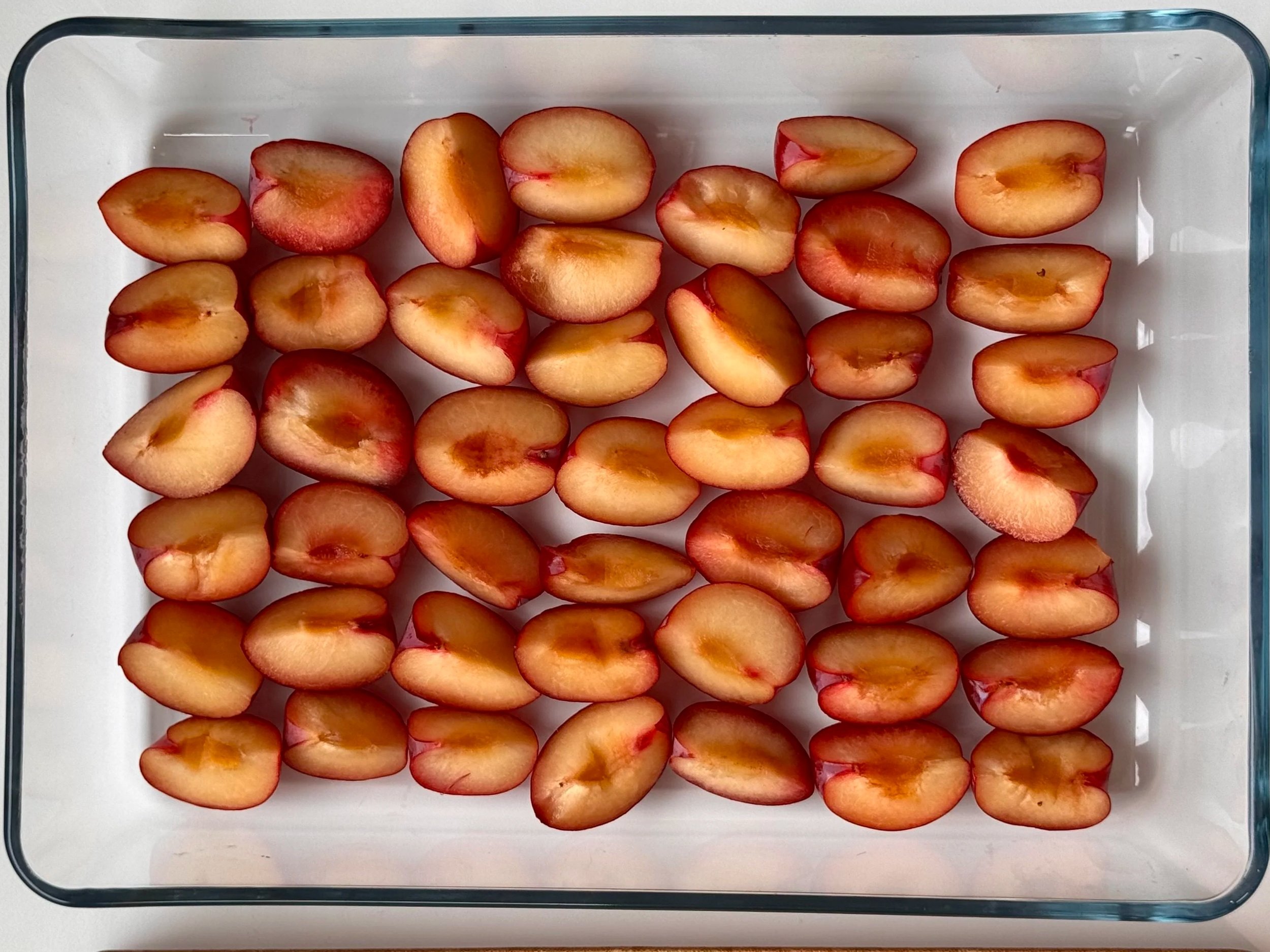 1) Del blommerne i halve, fjern stenen og skær dem derefter i kvarte. Læg dem i et ovnfast fad med snitfladen opad.