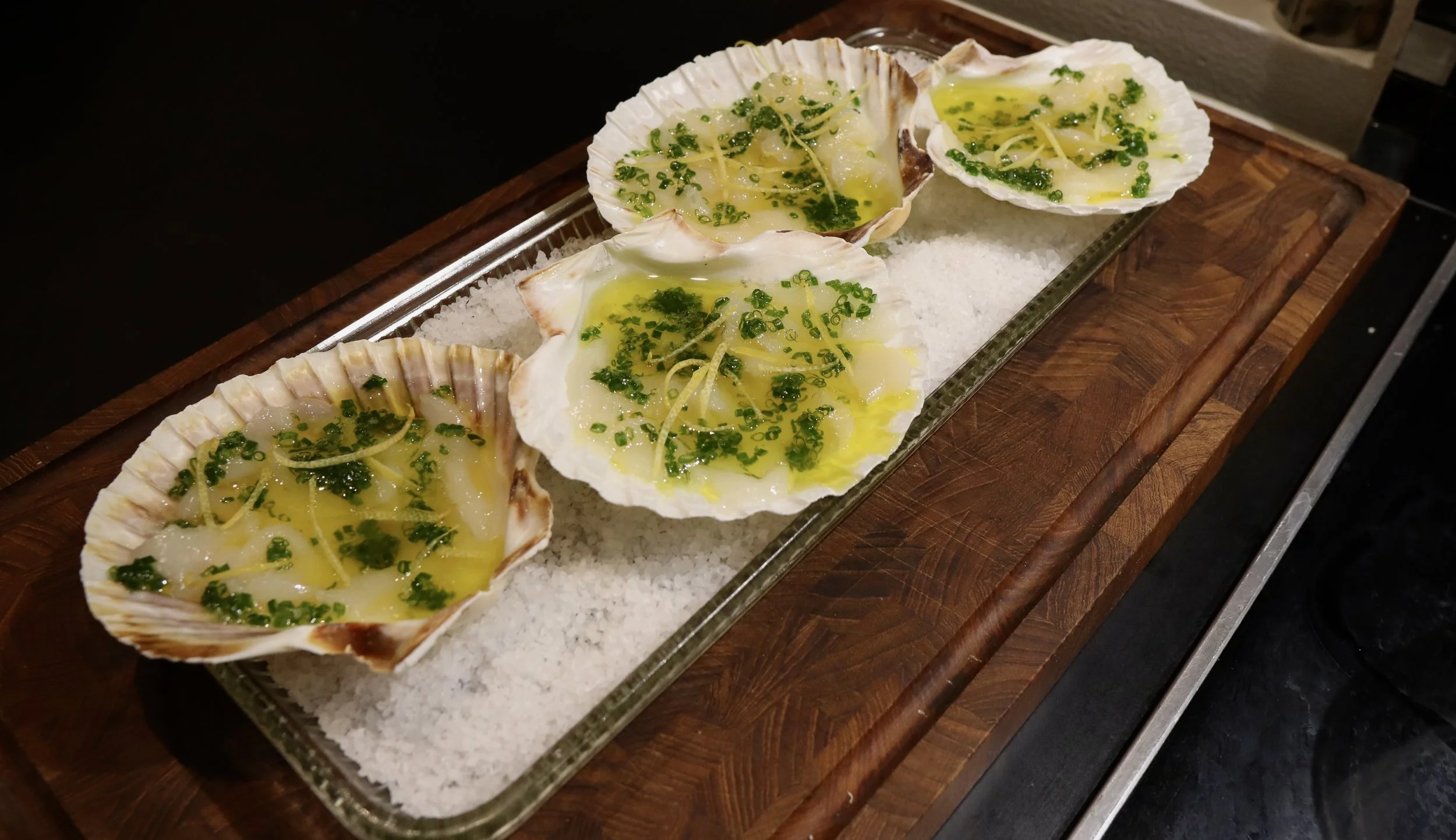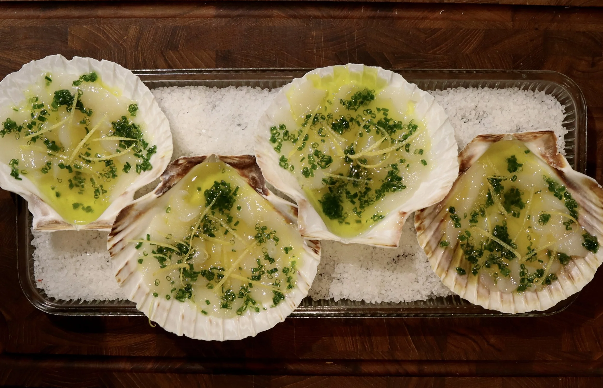 Kammusling ceviche i små skaller - smukt, enkelt og helt uimodståeligt. Med olie, purløg og et lille twist af citronskal bliver hver mundfuld en lille smagseksplosion, der får folk til at rose dig til skyerne, selvom det egentlig er en super simpel snack eller appetizer. Perfekte, små elegante bidder hvis der virkelig skal imponeres!