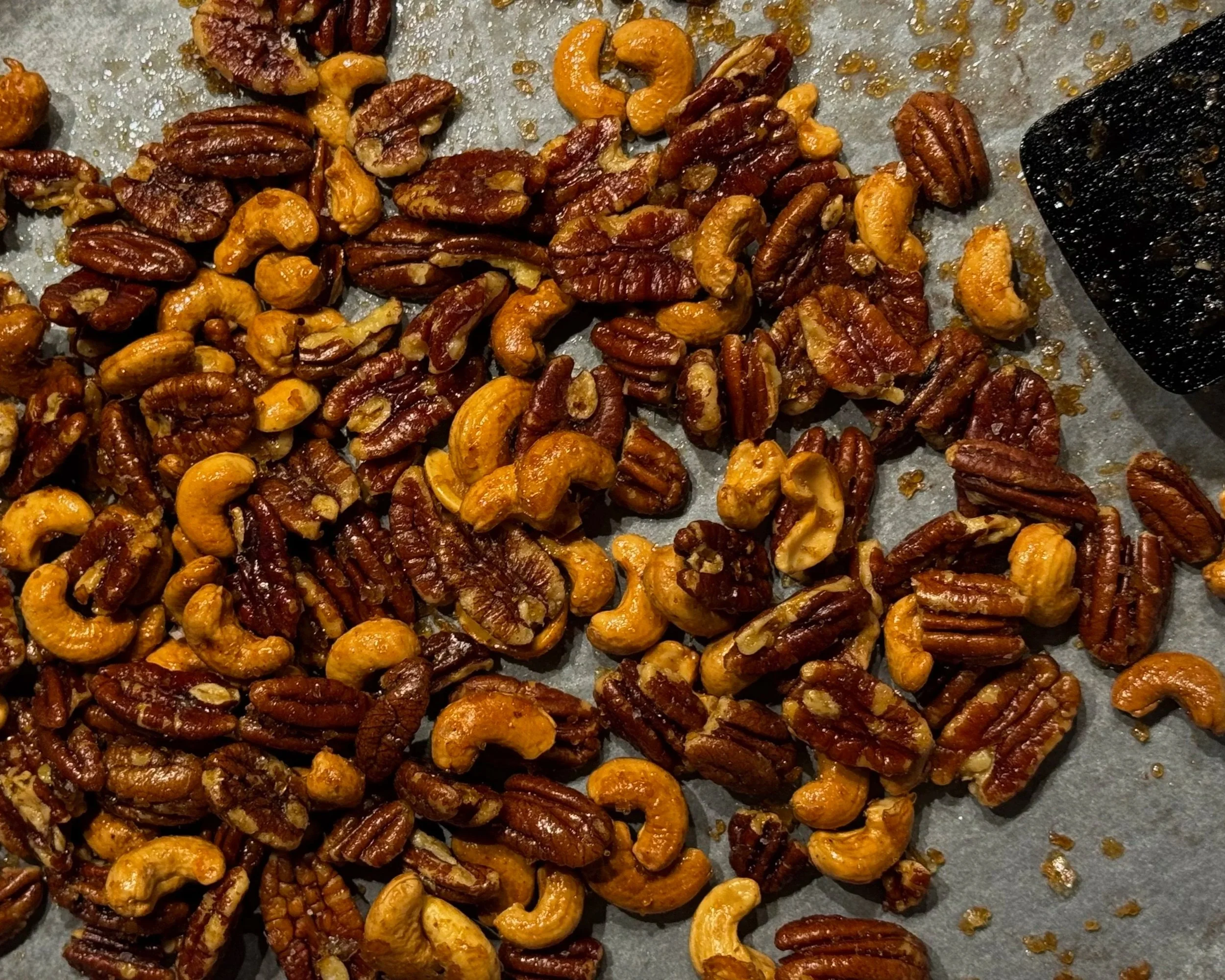 Søde og salte pecan- og cashewnødder - crunchy, uimodståelige og ren umami i hver bid. Kombinationen af det søde, salte og de sprøde nødder, gør denne snack fuldstændig afhængighedsskabende. Perfekte som små gæstesnacks, der forsvinder hurtigere, end man tror..