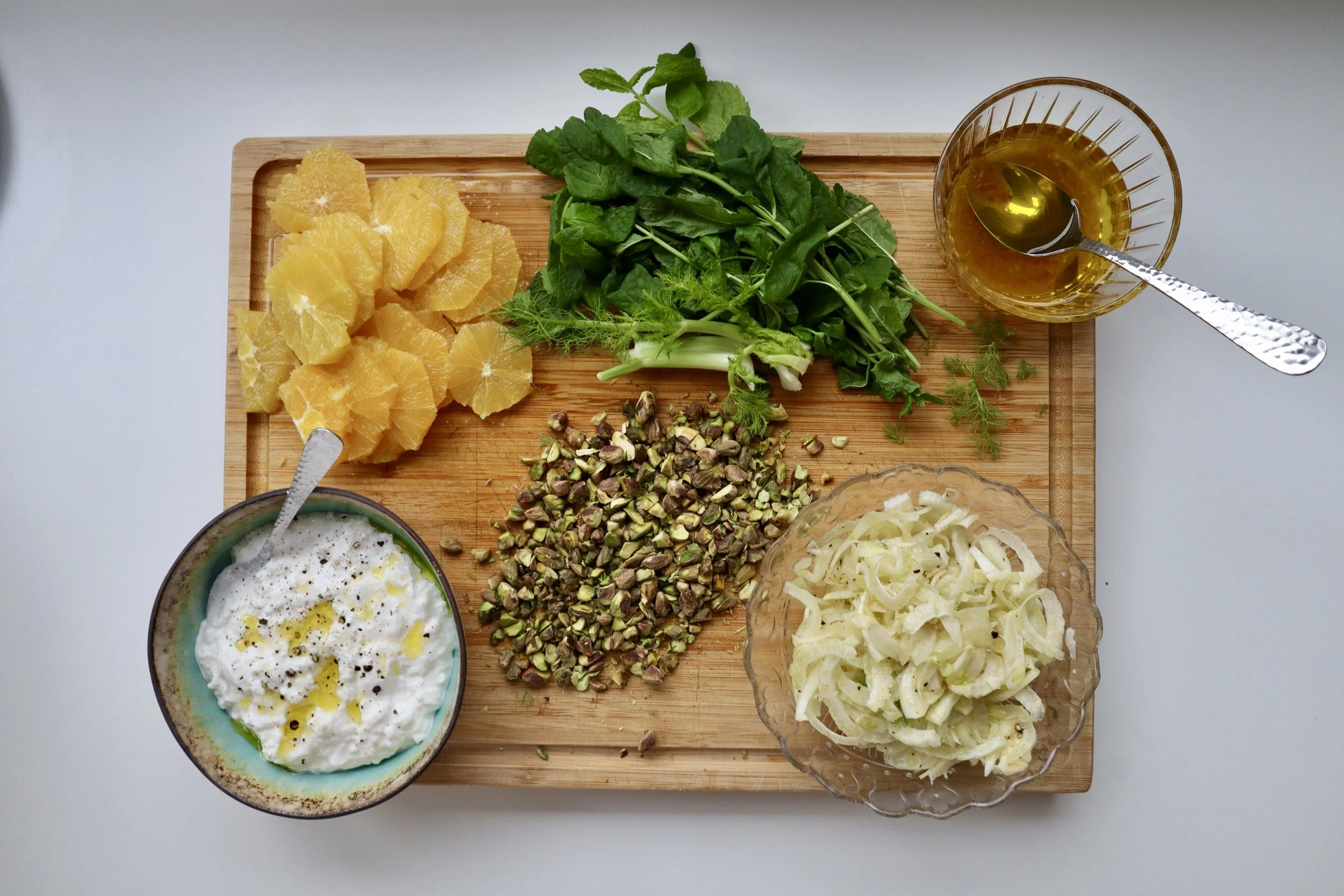 Skær appelsiner i fileter over en skål, så saften gemmes. Skær fennikel i meget tynde skiver (evt. på mandolin). Pluk mynte og fennikeltoppe groft.Lav dressingen