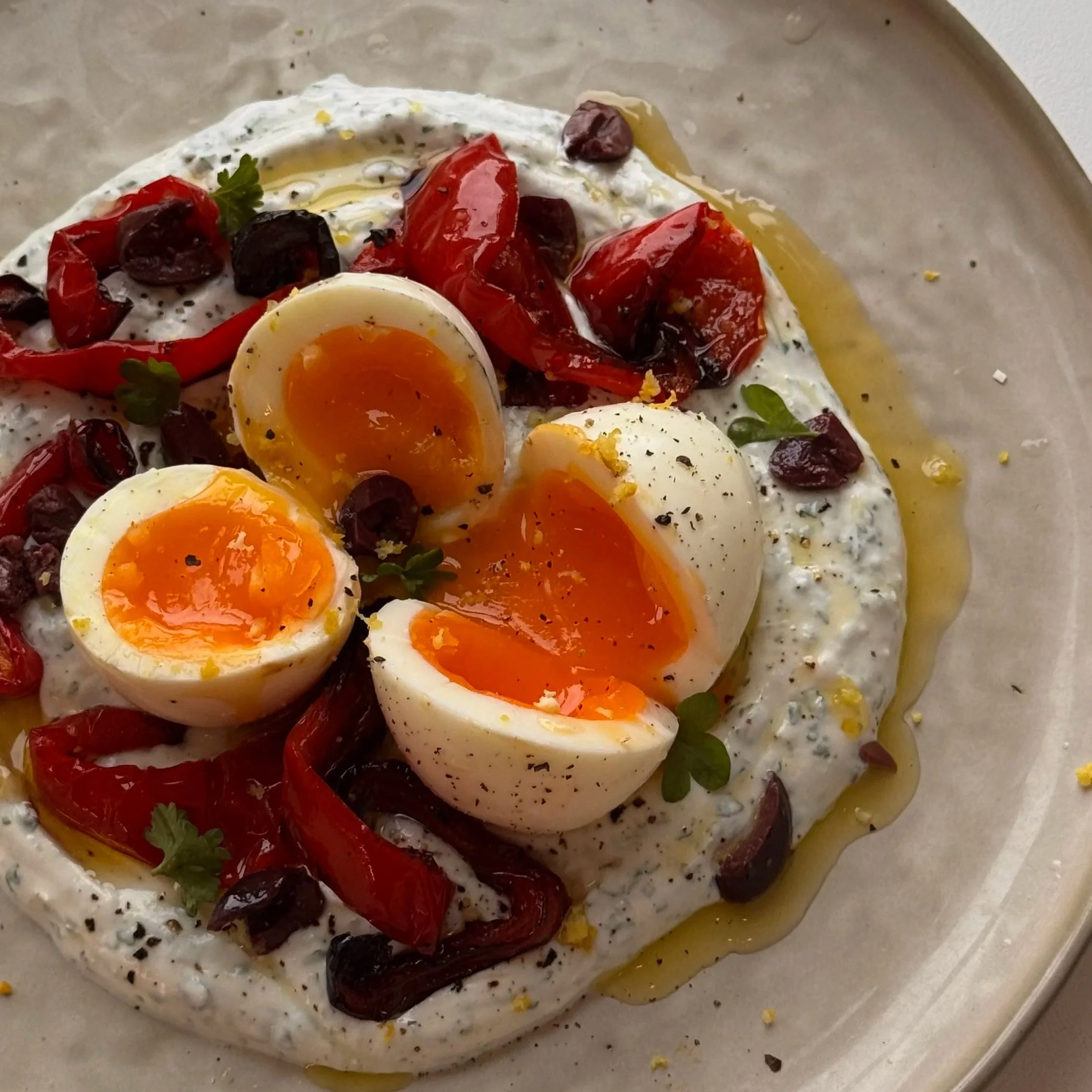 Jeg elsker brunchretter, der føles generøse uden at være komplicerede. Denne med blødkogte æg, bagt rød peber og en cremet base af græsk yoghurt og feta har masser af mellemøstlig karakter - og den leverer hver gang. De smilende æg løber blødt ned i den salte yoghurt, den sødmefulde peber og de grofthakkede kalamataoliven giver dybde, og friske krydderurter løfter det hele.