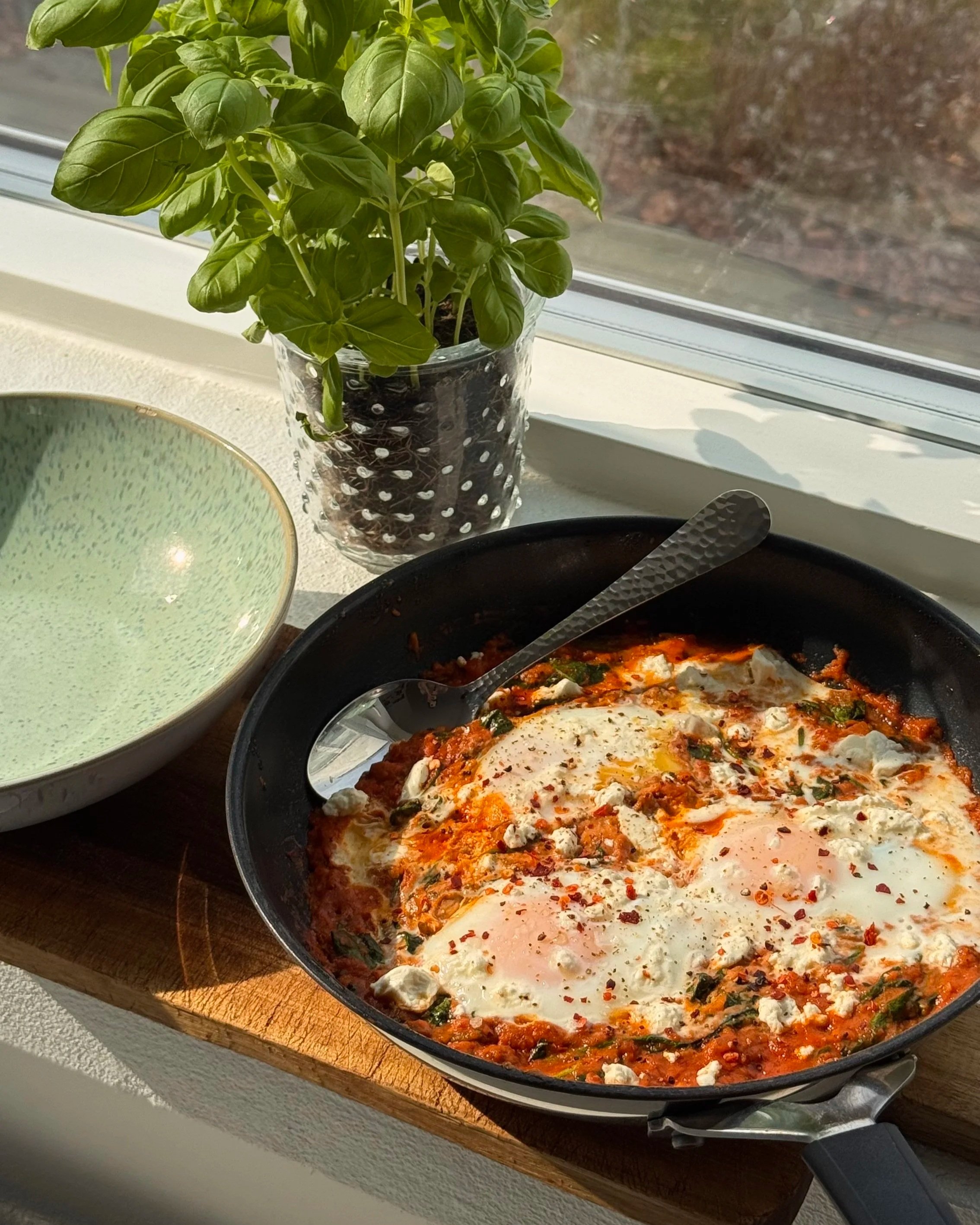 Æggene simrer i en krydret tomatsauce, hvor der er rørt lidt mascarpone i - bare nok til at gøre den blødere og mere rund i smagen. Toppet med feta, chili og frisk basilikum, som giver både salt, varme og friskhed.