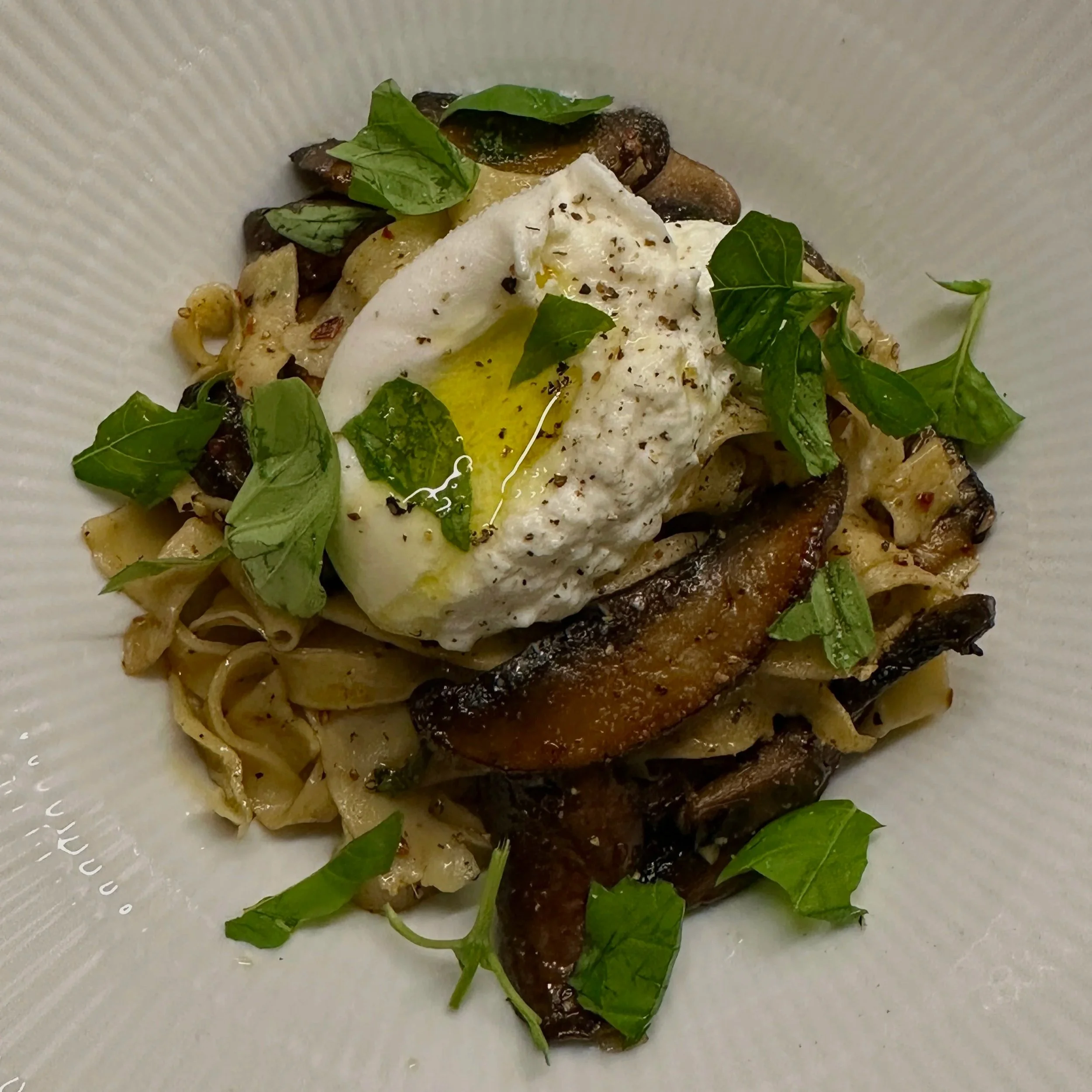 7) Anret pastaen på tallerkener, læg burrataen i midten, bræk den let op og dryp med god olivenolie.